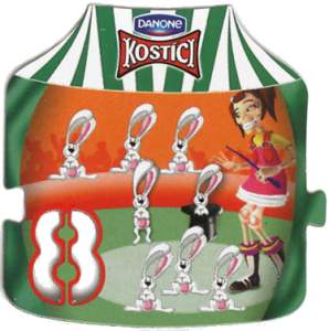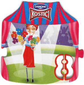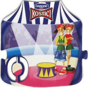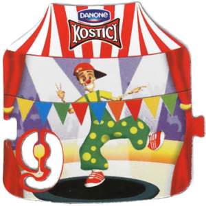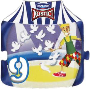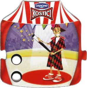 Magnetky čísel a znamenék v prostředí cirkusu pod víčky jogurtů Kostíci od firmy Danone